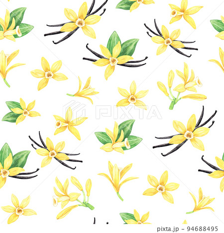 Watercolor yellow vanilla flowers, dried sticks and green leaves in seamless pattern. Background of blooming orchids. Hand drawn perfume ingredient for recipe, label, packaging design.