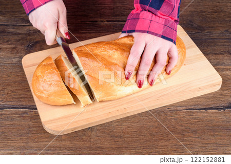 Young woman cutting a loaf of white bread on a wooden cutting board.