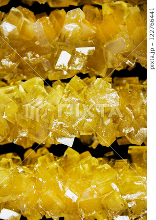 The sticks are made of sugar and are arranged in a line. A row of yellow crystals are lined up on a black surface. The crystals are all different sizes and shapes