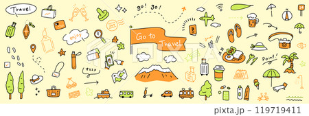 手書きの旅行イラスト。楽しくてかわいいイラストのセット。夏のバカンス、ビーチや買い物、食事や交通。