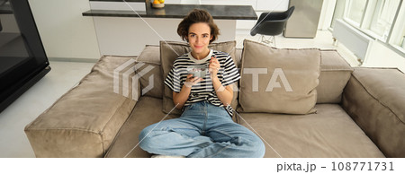 Upper angle shot of smiling female model, sitting on sofa in living room with bowl of cereals with milk, eating in front of tv, having her breakfast and relaxing