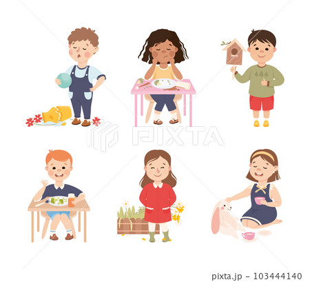 Little Boy and Girl Eating Breakfast, Grooming, Jumping in Mud and Picking Flowers Vector Set