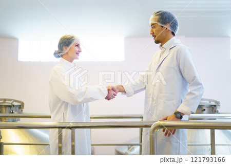 Team of quality control officers or factory engineers are inspecting inside the beverage manufacturing facility. Man and woman engineers working in a food production factory.