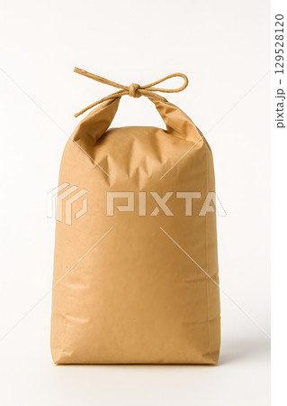 米袋 クラフト紙のパッケージ。白背景のスタジオ撮影モックアップ、コピースペースあり