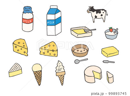 牛乳・乳製品の手描きイラストセット(カラー/輪郭線なし)