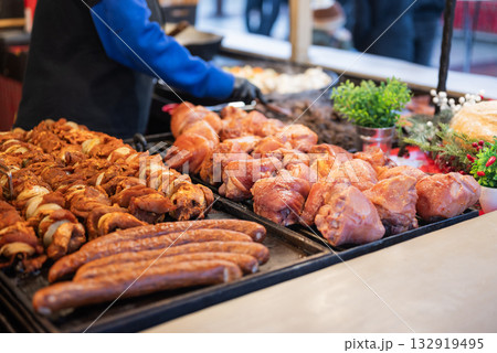 vendor fries meat and sausage on the grill in the city center at the Christmas market in Krakow Poland