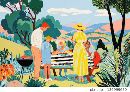 In a vibrant outdoor setting, a family gathers around a picnic table filled with delicious summer food, enjoying grilling and each other's company during a sunny day in the backyard