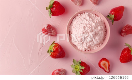 Strawberry fruit flour on bowl natural ingredient for cooking gluten free pink background