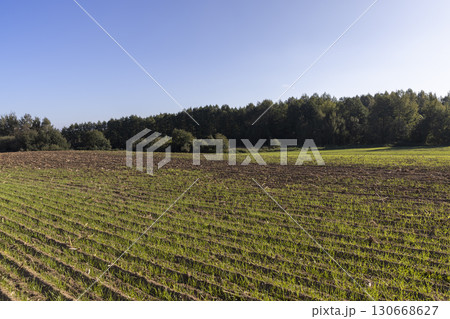 green shoots of frost-resistant wheat that was planted in winter, cereals in the autumn season before frost, sunny weather