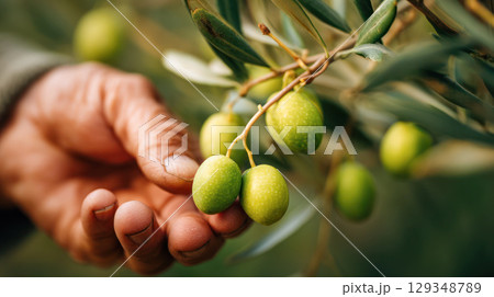Hand of a person gently reaching for ripe green olives on an olive tree branch, showcasing the beauty of nature and agricultural practices