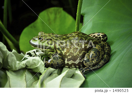 池に生えてるスイレンの葉に乗ってるウシガエル