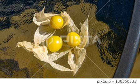 Golden berry macro with dewdrops showing detail physalis fruit in its papery husk a delicacy