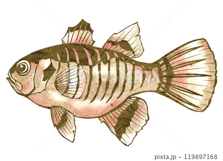 海水魚シマイサキのカラフルタイル画切り絵イラスト背景有り