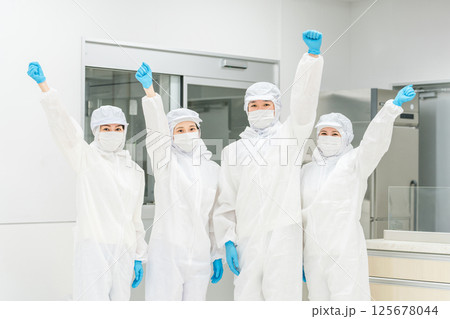 食品加工の仕事をする調理員の男女(食品衛生,食品工場,衛生服,衛生管理)