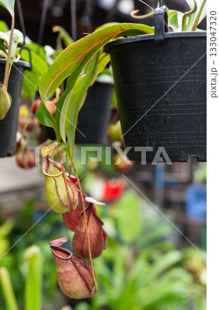 Close-up of tropical Pitcher plants (Nepenthes) hanging from a pot