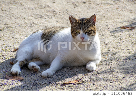 対馬山猫 陽だまりでお昼寝中 おゃ お目覚めです。