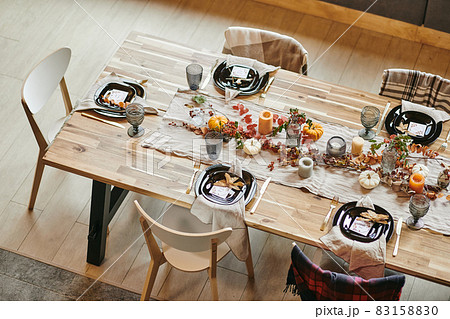 Top view of a modern minimal home dining room with a minimal wooden dining table and decor.