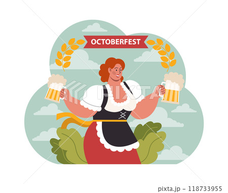 Oktoberfest festival. Cheerful Bavarian pub worker in a national costume. Character holding a full glass of beer with foam. Traditional annual beer carnival in Germany. Flat vector illustration