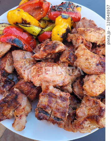 barbecue with vegetables on a plate in the backyard of the house in summer