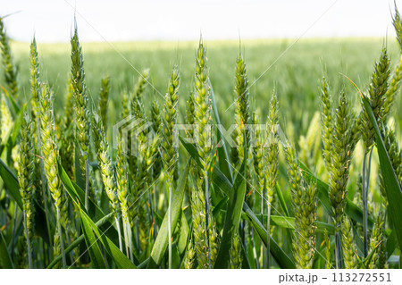 Green wheat field. Green background with wheat. Young green wheat seedlings growing on a field. Agricultural field on which grow immature young cereals, wheat