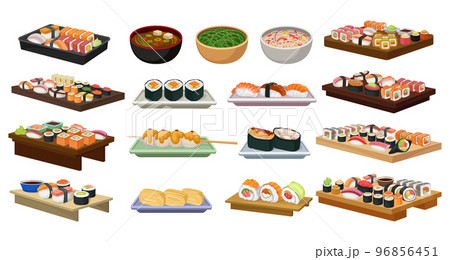 Different Sushi and Maki Served on Board with Soy Sauce and Bowl with Noodles Big Vector Set