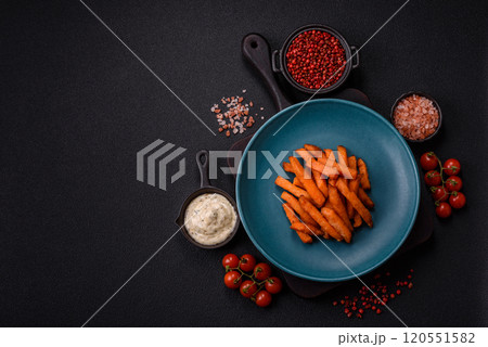 Delicious crispy sweet potato fries with salt, spices and herbs