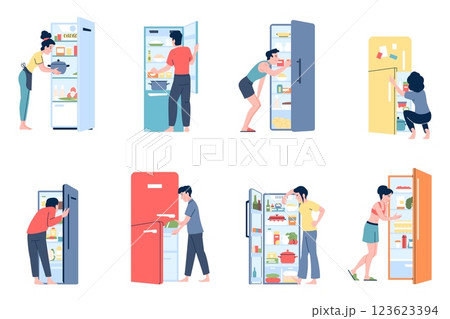 People and fridge. Men women using refrigerator, looking snacks and food, put out cooking meals. Fridges at home kitchen, daily eating routine recent vector set