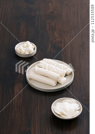 With a wooden table in the background, jorangi, garae, and tteokguk are placed on a plate