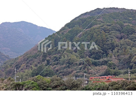 山脈をバックに穏やかな海岸線を走る40系気動車