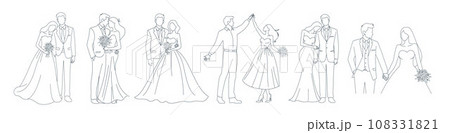 Happy wedding bride and groom at wedding ceremony. Beautiful wedding couple in wedding clothes, couple with beauty wedding bouquet line art
