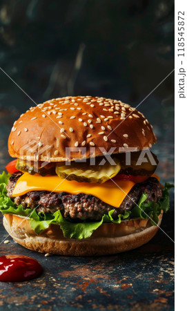 Luxurious cheeseburger with beef patty, cheddar, lettuce, tomato, pickles, and ketchup on sesame buns