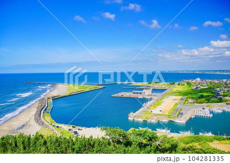 千葉県旭市の飯岡刑部岬(ぎょうぶみさき)展望館から西側の眺望(飯岡漁港,旭市など)