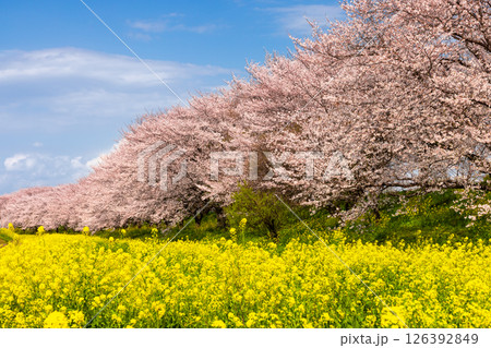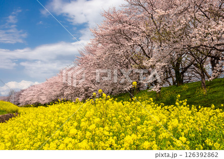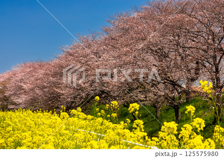 埼玉県比企郡吉見町飯島新田 さくら堤公園の桜並木と土手斜面の菜の花畑の景色
