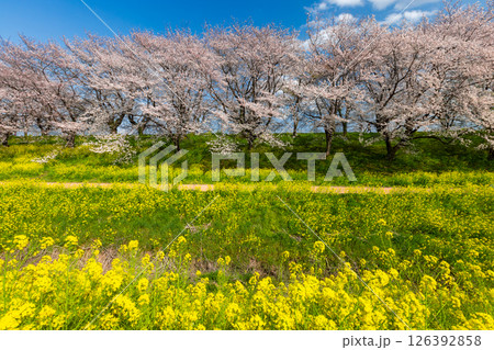 埼玉県比企郡吉見町飯島新田 快晴青空のさくら堤公園の桜並木と菜の花畑の景色