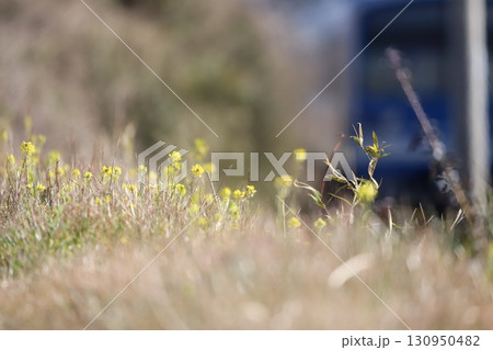 ピンボケした菜の花と電車の車両
