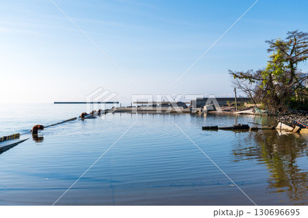 地盤沈下で海水が堤防に浸水している飯田港の風景