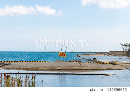 堤体がボロボロになり海水が侵入している飯田港の風景