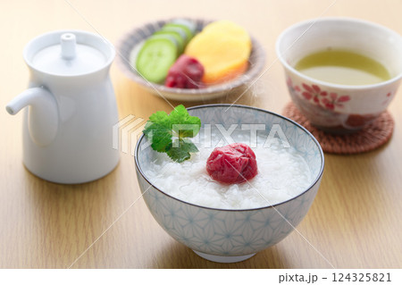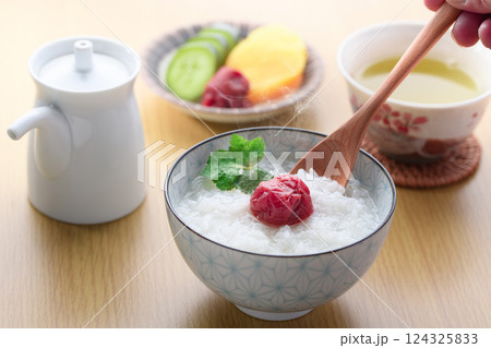 梅干しを入れたお粥(梅がゆ)みょうがのお漬物を添えて