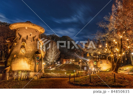 埼玉県飯能市のトーベ・ヤンソンあけぼの子どもの森公園のライトアップされた建物と星と紅葉
