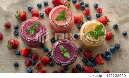 Four different colored smoothies with blueberries and mint on top