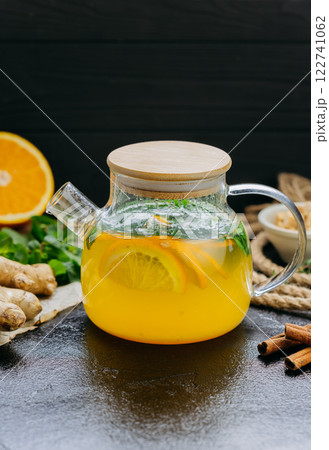 Glass teapot with citrus and ginger herbal tea, infused with fresh mint and cinnamon