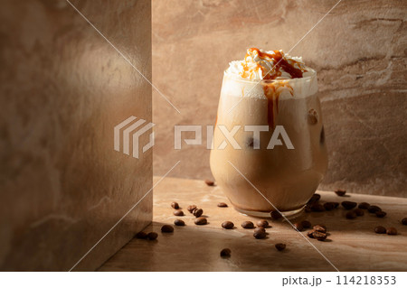 Iced caramel latte topped with whipped cream and caramel sauce.
