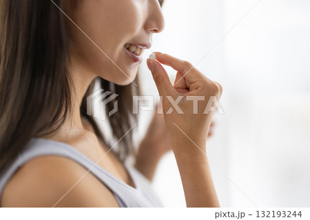 錠剤を飲もうとするミドル女性