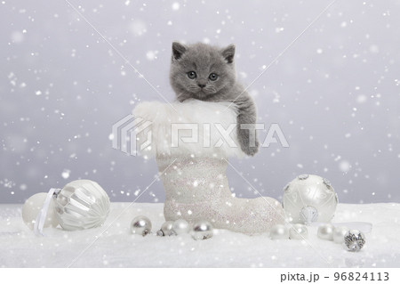 Cute grey baby cat in a white santa's boot and white christmas ornaments with snow