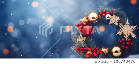 やさしくぼかされた青い背景の上に、星とバブルで飾られたクリスマスツリー。