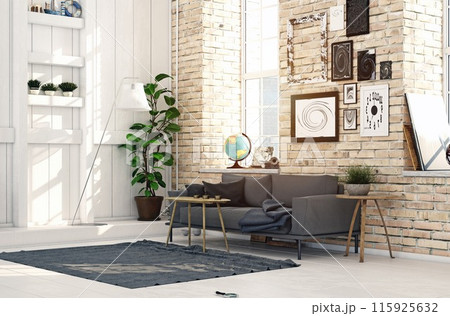 Empty gray loft interior with old wood floor and stucco wall. 3d render illustration mockup.