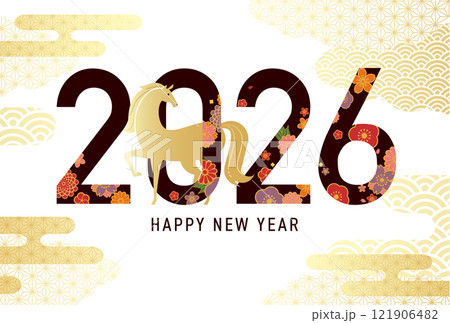 2026年の午年の年賀状テンプレート。ベクターイラスト。(馬、馬年)