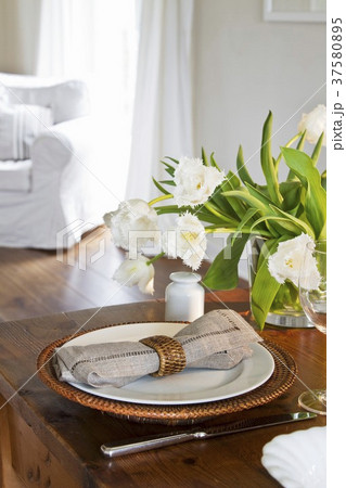 White tulip flowers in vase standing coffee table with blurred interior background.