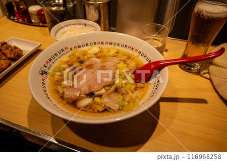 2024年1月8日:大阪神座拉麵店內的風景、食物和啤酒,這是一家專門從事麵條湯的餐廳