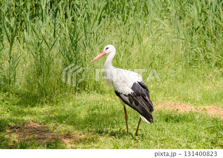 A white stork looks for food in the grass
